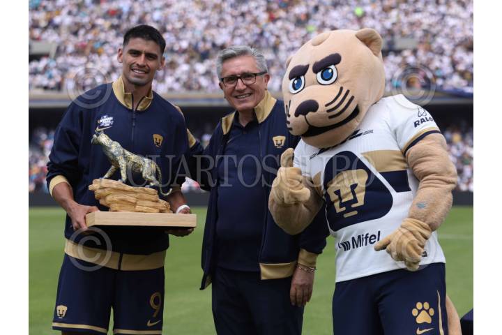 CIUDAD DE MÉXICO, 06JULIO2025.- Guillermo Martínez, delantero del Club Pumas, recibió el trofeo de un final al ser el equipo ganador con 2-0 derrotando al Club Deportivo Leganés en un partido amistoso, disputado en el Estadio Olímpico Universitario. FOTO: GRACIELA LÓPEZ/CUARTOSCURO.COM