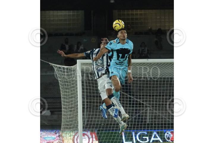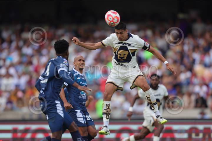 CIUDAD DE MÉXICO, 20JULIO2025. El jugador Universitario Guillermo Martínez remata de cabeza durante el partido de fútbol Pumas vs Pachuca correspondiente a la jornada 2 del Torneo Apertura 2025 de Liga BBVA MX, en el Estadio Olímpico Universitario. FOTO: EDGAR NEGRETE LIRA/CUARTOSCURO.COM