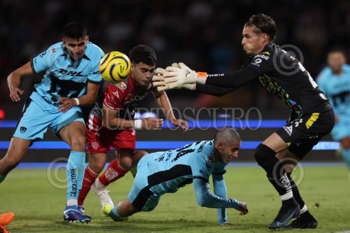 CIUDAD DE MÉXICO, 31ENERO2024. Guillermo Martínez, Agustín Oliveros, Santiago López y el portero de Necaxa Luis Unsain disputan una pelota durante el partido de fútbol Pumas vs Necaxa correspondiente a la jornada 4 del Torneo Clausura 2024 de Liga BBVA MX, en el Estadio Olímpico Universitario. FOTO: EDGAR NEGRETE LIRA/CUARTOSCURO.COM