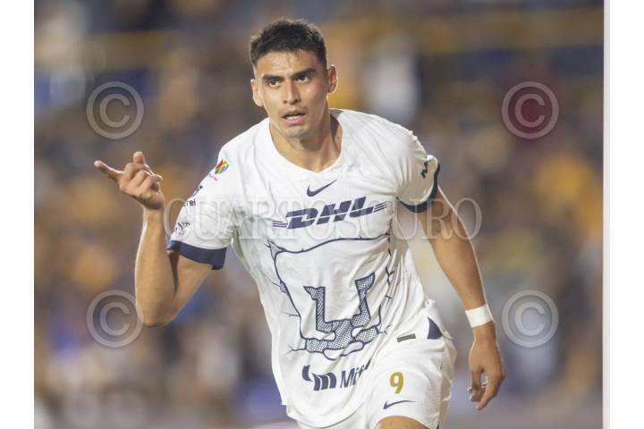 SAN NICOLÁS DE LOS GARZA, NUEVO LEÓN, 03FEBRERO2024.- Guillermo Martínez de Pumas, festeja el gol, ante los Tigres, en el estadio Universitario, partido correspondiente a la jornada 5 de la Clausura 2024, de la Liga, MX. Marcador Final: Tigres: 2 - Pumas: 2. FOTO: GABRIELA PÉREZ MONTIEL / CUARTOSCURO.COM