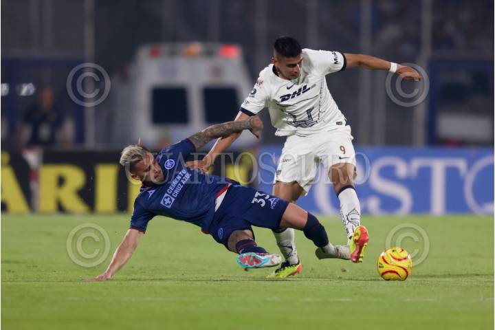 CIUDAD DE MÉXICO, 30MARZO2024. Gonzalo Piovi de la Máquina Celeste y Guillermo Martínez de Pumas disputan una pelota durante el partido de fútbol Pumas vs Cruz Azul correspondiente a la jornada 13 del Torneo Clausura 2024 de Liga BBVA MX, en el Estadio Olímpico Universitario. FOTO: EDGAR NEGRETE LIRA/CUARTOSCURO.COM
