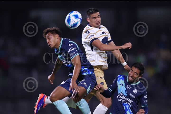 CIUDAD DE MÉXICO, 17SEPTIEMBRE2024. Efraín Orona y Pablo González de La Franja disputan una pelota aérea a Guillermo Martinez de Pumas durante el partido de fútbol Pumas vs Puebla correspondiente a la jornada 8 del Torneo Apertura 2024 de Liga BBVA MX, en el Estadio Olímpico Universitario. FOTO: EDGAR NEGRETE LIRA/CUARTOSCURO.COM