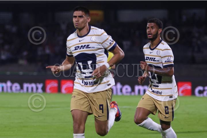 SAN NICOLÁS DE LOS GARZA, NUEVO LEÓN, 03FEBRERO2024.- Guillermo Martínez y Lisandro Magallan de Pumas, festejan el gol, ante los Tigres, en el estadio Universitario, partido correspondiente a la jornada 5 de la Clausura 2024, de la Liga, MX. Marcador Final: Tigres: 2 - Pumas: 2. FOTO: GABRIELA PÉREZ MONTIEL / CUARTOSCURO.COM