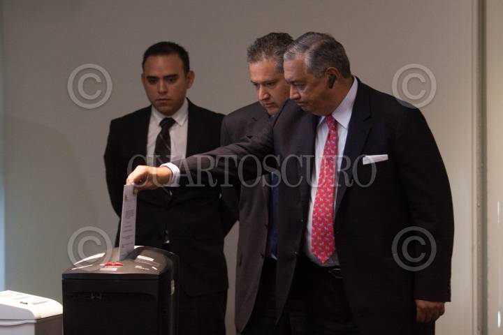 MÉXICO, D.F., 11MARZO2015.- Guillermo Villareal Torres, Fedetario Público y José López Hoyo, director general de economía del espectro y recursos orbitales, destruyeron el sobre con la oferta de cobertura y económica de Centro de Información Nacional de Estudios Tepeyac quien se desistió en la licitación para una de las dos nuevas cadenas de televisión abierta digitales, hoy se sesionó en el Ifetel para abrir las propuestas de las otras empresas. FOTO: MOISÉS PABLO /CUARTOSCURO.COM