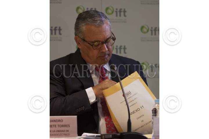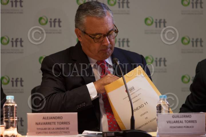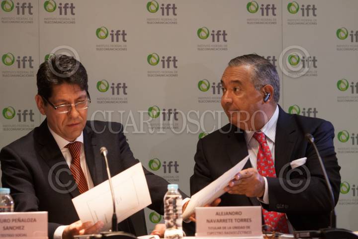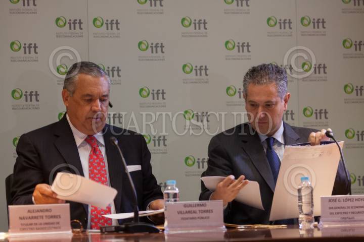 MÉXICO, D.F., 11MARZO2015.- Alejandro Navarrete Torres, titular de la unidad de espectro radioeléctirco y Guillermo Villareal Torres, Fedetario Público, durante la sesión en el Ifetel luego de que se abrieran los sobres con las propuesta económicas y de cobertura para las dos nuevas cadenas de televisión abierta digitales. FOTO: MOISÉS PABLO /CUARTOSCURO.COM