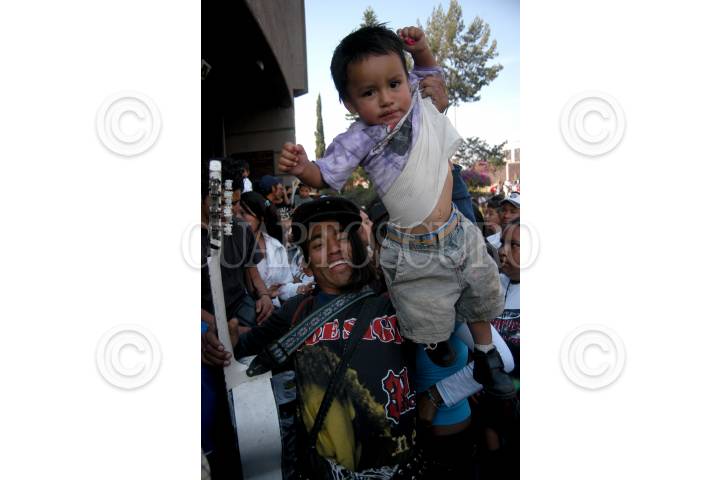 MÉXICO D.F. 14ENERO2007.- Un guitarristas urbano, festeja al termino de la peregrinación de los guitarristas, levantado a su hijo, esto a las afueras de la Basílica de Guadalupe. FOTO: GUILLERMO PEREA /CUARTOSCURO.COM