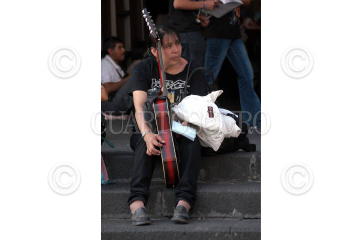 MÉXICO D.F. 14ENERO2007.- Una mujer con una guitarra, descansa en los escalones a la entrada de la Basílica de Guadalupe, después de realizara la peregrinación con los guitarristas urbanos FOTO: GUILLERMO PEREA /CUARTOSCURO.COM