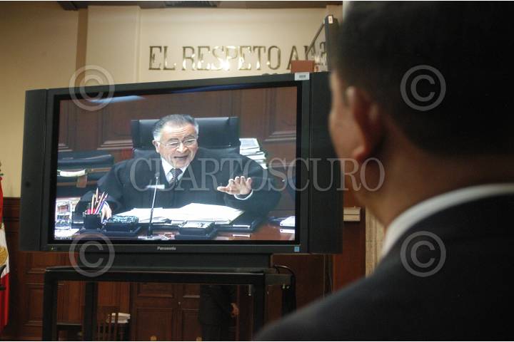 MÉXICO D.F. 08NENRO2006.- Imagen del magistrado Mariano Azuela Güitrón en uno de los monitores de la sala durante la sesión de la suprema corte de justicia, donde se voto por la controvercia del poder judicial de Talxcala. FOTO. GUILLERMO PEREA /CUARTOSCURO.COM