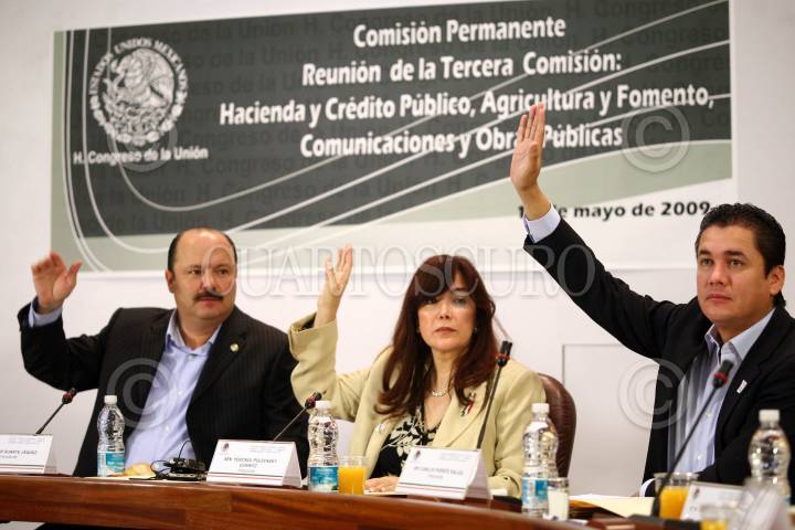 MÉXICO, D.F., 13MAYO2009.- Cesar Duarte Jáquez, presidente de la mesa directiva de la Cámara de Diputados; Yeidckol Polevnsky Gurwitz, senadora del PRD y Carlos Alberto Puente, diputado del PVEM, durante la reunión de trabajo de la Tercera Comisión de la Permanente. FOTO: CUARTOSCURO.COM