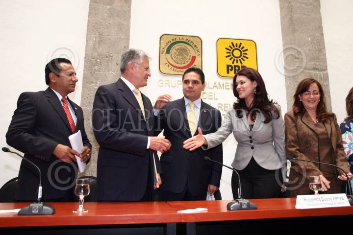 MÉXICO, D.F., 28JULIO2009.- Los senadores del PRD Yeidckol Polevnsky Gurwitz, Silvano Aureoles Conejo, Alfonso Sánchez Anaya, Lázaro Mazón Alonso y Francisco Castellón Fonseca, urgieron a restablecer el orden constitucional en Honduras y rechazaron la violencia del gobierno de facto contra los defensores del régimen democrático en esa nación. Al evento asistieron Rosalinda Bueso, embajadora de Honduras, Rebeca Santos, ministra de Finanzas y Marlón Brevé, ministro de Educación de ese país. FOTO: CUARTOSCURO.COM