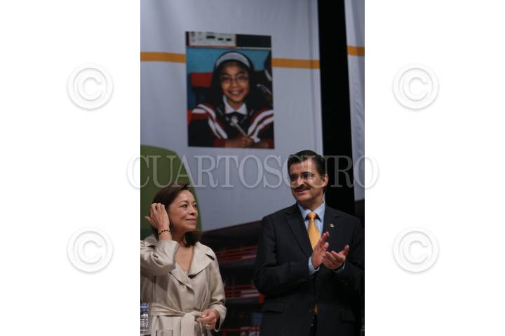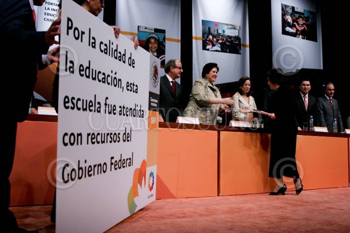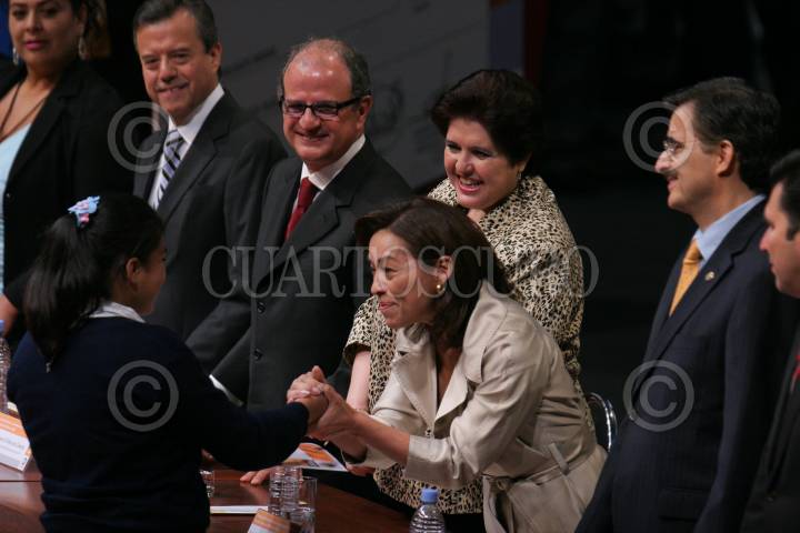 MÉXICO, D.F., 11FEBRERO2009.-La senadora Teresa Ortuño Gurza y Josefina Vázquez Mota, secretaria de Educación Publica, aseguraron que esta dependencia rehabilitará mil 161 primarias y secundarias en el Distrito Federal durante el presente ciclo escolar como parte de su programa de mejoramiento de infraestructura de educación básica en el país, en este programa se invertirán 493 millones de pesos, la titular de la SEP, Indicó que en lo que va del ciclo escolar se han renovado 102 planteles y se prevé para mayo entregar 566 instalaciones más rehabilitadas a fin de que antes de septiembre se tenga la meta programada, esto durante un evento realizado en el Auditorio Nacional. FOTO: RICARDO CASTELAN/CUARTOSCURO.COM