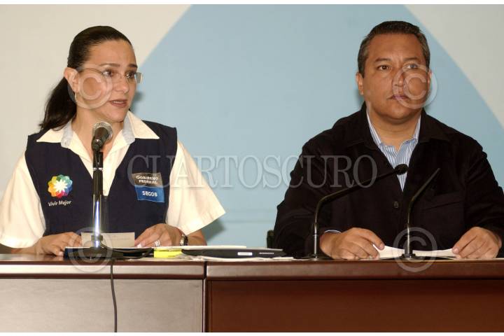 MÉXICO, D.F., 17SEPTIEMBRE2010.- Laura Gurza Jaidar, Coordinadora Nacional de Protección Civil junto a Francisco Blake Mora, Secretario de Gobernación durante la conferencia que se realizó para dar los pormenores de las acciones que se tomaran durante el paso del huracan Karl en el pais. FOTO: CUARTOSCURO.COM