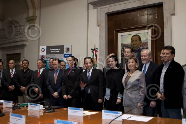 MÉXICO, D.F., 22AGOSTO2011.- Luis Cárdenas Palomino, coordinador de la División de Seguridad Regional de la Secretaría de Seguridad Pública Federal (SSP); Laura Gurza Jaidar, coordinadora general de Protección Civil; Bernardo de la Garza, director general de la Comisión Nacional de Cultura Física y Deporte; Justino Compeán y Decio de María, presidente y secretario general de la Federación Mexicana de Fútbol; ofrecieron conferencia de prensa después de haberse reunido esta mañana con Francisco Blake Mora, secretario de Gobernación para dar seguimiento a los hechos suscitados el sábado pasado donde un grupo armado se enfrento a balazos con policías en las inmediaciones del Estadio Territorio Santos Modelo (TSM) lo que provocó crisis nerviosa entre los asistentes y la suspensión del partido Santos Monarcas. FOTO: ESPECIAL/CUARTOSCURO.COM