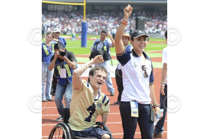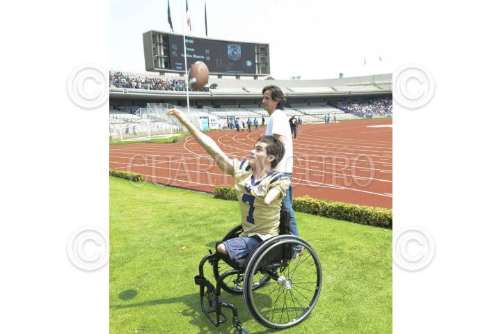 MÉXICO, D.F., 22SEPTIEMBRE2012.- Gustavo Sánchez multimedallista en los Juegos Paralímpicos de Londres 2012, acudió a el clásico entre los Pumas CU contra Águilas Blancas. Los auriazules se impusieron 28-10 en la cancha del Estadio Olímpico Universitario. FOTO: IVÁN MENDEZ /CUARTOSCURO.COM