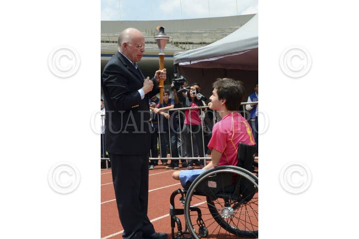MÉXICO, D.F., 24AGOSTO2013.- José Narro Robles, rector de la UNAM, y el nadador paralímpico Gustavo Sánchez, durante la ceremonia del encendido de la falama del pebetero del Estadio Olímpico Universitario en una ceremonia que sirvió como preludió a la celebración del XXXI edición Maratón Internacional de la Ciudad. La llamada "Flama de Maratón, símbolo de la paz mundial, paseo por la ciudad, para culminar en el histórico estadio de las Olímpiadas del 68. FOTO: CUARTOSCURO.COM