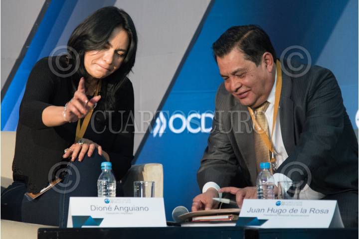 CIUDAD DE MÉXICO, 13MARZO2018.- Dione Anguiano, jefa delegacional de Iztapalapa, y Juan Hugo de la Rosa, presidente municipal de Nezahualcóyotl, durante su participación en la mesa de diálogo "Impulsar el desarrollo de las regiones: hacia un federalismo eficaz y transparente", en el marco del Foro OCDE México 2018. FOTO: MARIO JASSO /CUARTOSCURO.COM