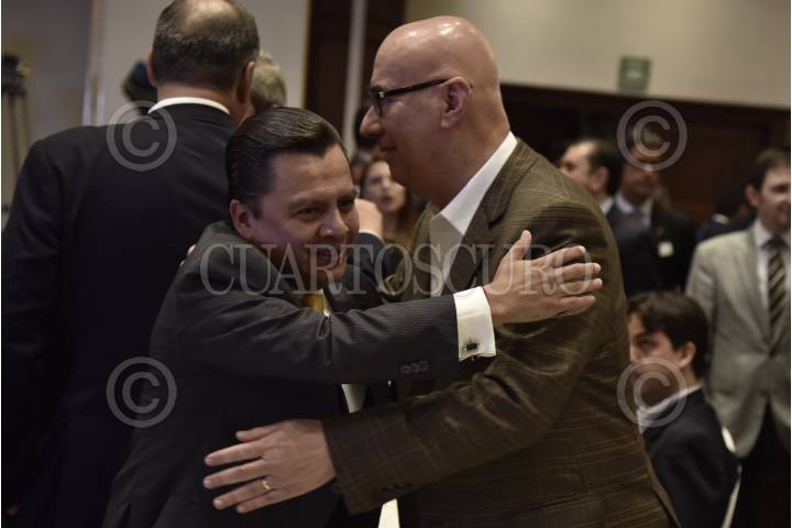 CIUDAD DE MÉXICO, 14JUNIO2018.- Manuel Granados, presidente del PRD, abraza a Dante Delgado, dirigente de Movimiento Ciudadano, durante una comida organizadA por la Coparmex, en donde estuvieron representantes de otras fuerzas políticas. FOTO: MARIO JASSO /CUARTOSCURO.COM