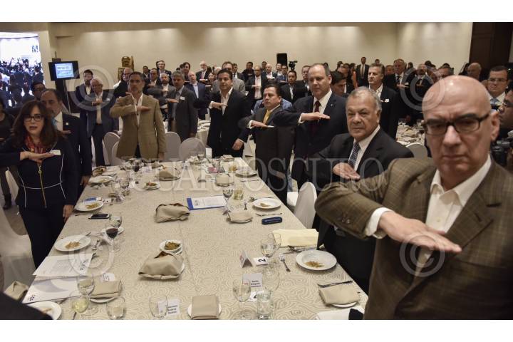 CIUDAD DE MÉXICO, 14JUNIO2018.- La Coparmex invitó a una comida a los dirigentes de los principales partidos políticos, el evento estuvo encabezado por su presidente Gustavo de Hoyos Walther. En la imagen se aprecia a Yeidckol Polevnsky de Morena; Luis Castro Obregón de Nueva Alianza; Damián Zepeda dirigente del PAN; Manuel Granados del PRD; Alberto Anaya del PT, y Dante Delgado de Movimiento Ciudadano. FOTO: MARIO JASSO /CUARTOSCURO.COM