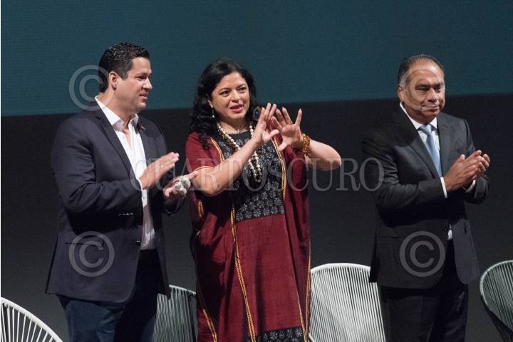 CIUDAD DE MÉXICO, 04JULIO2019.- Diego Sinhue Rodríguez Vallejo, gobernador de Guanajuato; Alejandra Frausto, secretaria de Cultura federal, y Héctor Astudillo Flores, gobernador de Guerrero, durante la presentación de la programación de la edición 47 del Festival Internacional Cervantino (FIC) que se realizará del 9 al 27 de octubre, la cual contará con 295 actividades, de ellas 32 serán dedicadas al tema de migración. FOTO: MARIO JASSO /CUARTOSCURO.COM