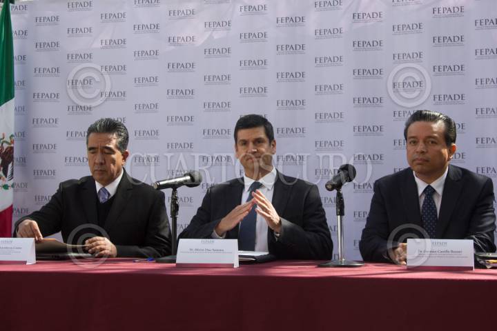 CIUDAD DE MÉXICO, 22ENERO2018.- Jorge Lumbreras Castro, coordinador de Asesores de la Fiscalía Especializada para la Atención de Delitos Electorales (FEPADE), Héctor Díaz Santana, fiscal especial para la Atención de Delitos Electorales, y Germán Castillo Banuet, director general de Averiguaciones Previas y Control de Procesos en Materia de Delitos Electorales, durante la conferencia de prensa para dar a conocer que dicha institución a atraído las investigaciones por un presunto desvío de recursos, de aproximadamente 250 millones de pesos, por parte del ex gobernador de la entidad, César Duarte. FOTO: GALO CAÑAS /CUARTOSCURO.COM