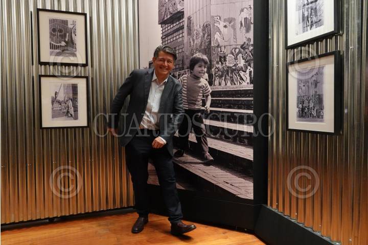 Héctor García García, hijo del fotógrafo Héctor García, posa a lado de un a imagen suya de niño durante la exposición "El lado oscuro del régimen: la protesta del 58 y el 68" en el Centro Cultural Los Pinos