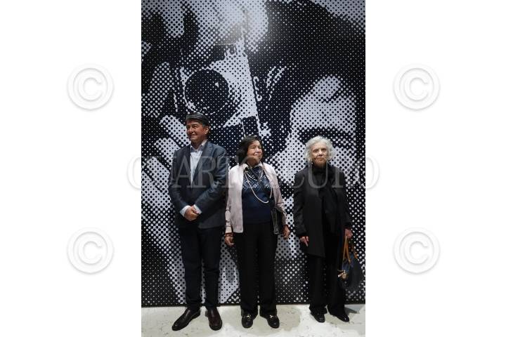 La escritora Elena Poniatowska, Héctor García García, hijo del fotógrafo Héctor García, y Alejandra Frausto, secretaria de Cultura, conversaron durante la exposición "El lado oscuro del régimen: la protesta del 58 y el 68" en el Centro Cultural Los Pinos