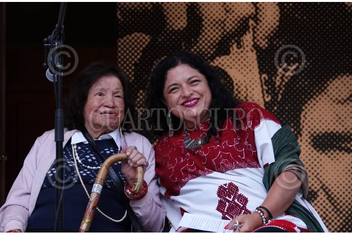 La fotógrafa María García y Alejandra Frausto, secretaria de Cultura, durante la exposición "El lado oscuro del régimen: la protesta del 58 y el 68" en el Centro Cultural Los Pinos