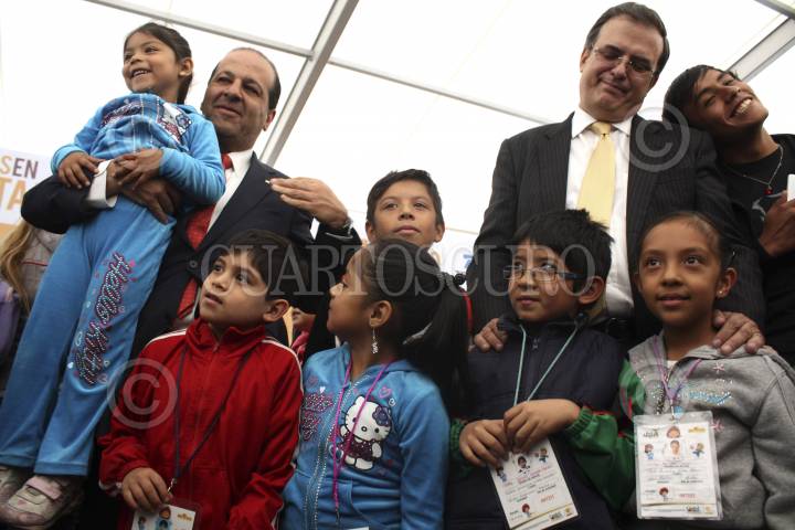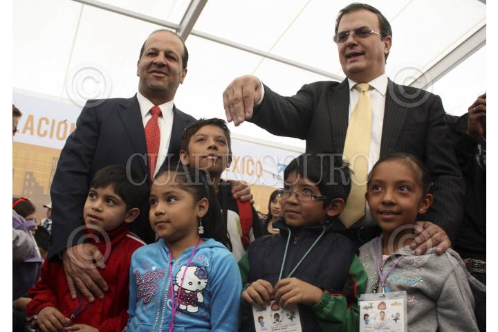MÉXICO, D.F., 14NOVIEMBRE2012.- Marcelo Ebrard Casaubón, Jefe de Gobierno del Distrito Federal y Héctor Slim Seade, director general de Teléfonos de México, encabezaron el evento “Logros en digitalización en la ciudad de México Telmex" en presencia de niños y jóvenes estudiantes, que se realizó en el Parque México. FOTO: ADRIANA ÁLVAREZ /CUARTOSCURO.COM