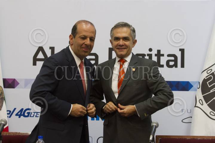 MÉXICO, D.F., 10JUNIO2015.- Héctor Slim Seade, director general de Teléfonos de México y Miguel Ángel Mancera, Jefe de Gobierno, ofrecieron una conferencia de prensa para hablar sobre la instalación de la Aldea Digital en el Zócalo, la rueda de prensa se dió en el salón Juárez del Antiguo Palacio del Ayuntamiento. FOTO: MOISÉS PABLO /CUARTOSCURO.COM