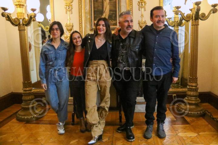 El produtor Óscar Uriel, Kate del Castillo, Angélica Rogel, Margarita Sanz y Naian González durante la develación de placa por el fin de temporada de la puesta en escena "Hamlet" que se presenta en el Teatro Milan.