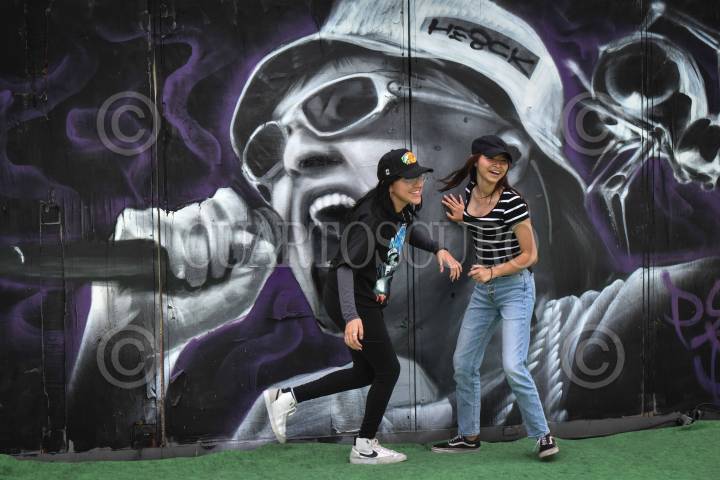 CIUDAD DE MÉXICO, 09SEPTIEMBRE2023.- Dos mujeres buscan una fotografía en un mural del cantante "Peso Pluma" durante el festival de música regional "Arre HSBC 2023" celebrado en las instalaciones del Autódromo Hermanos Rodríguez. FOTO: MARIO JASSO/CUARTOSCURO.COM