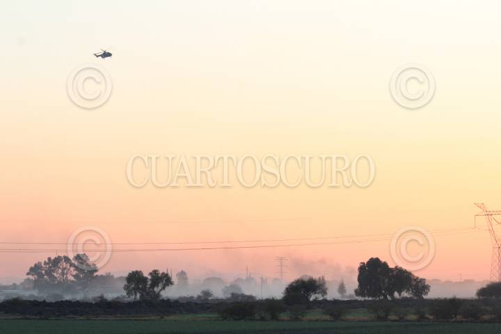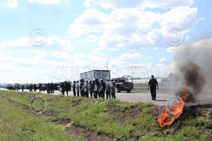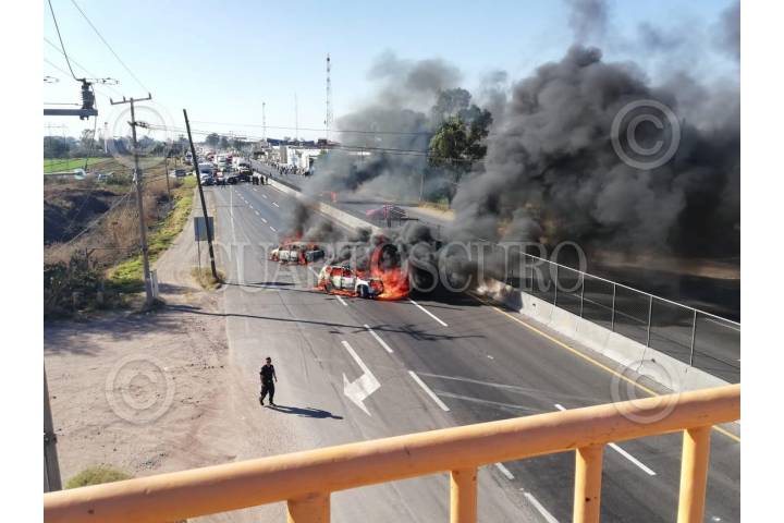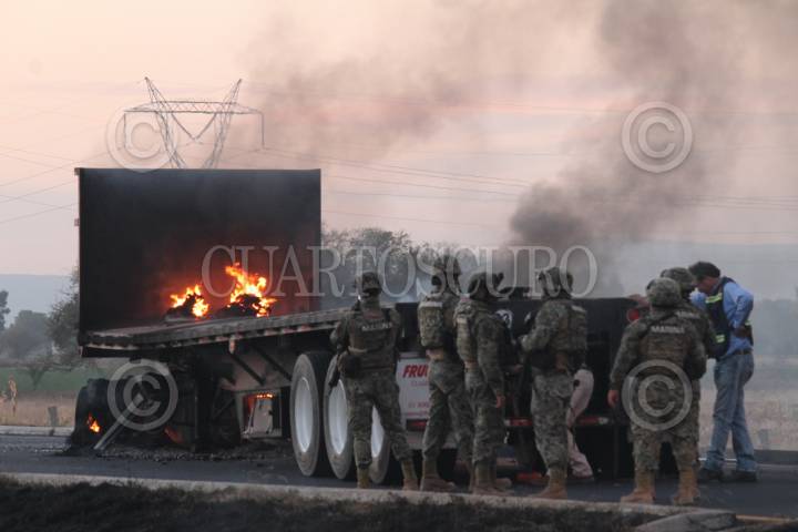 MUNICIPIO DE VILLAGRÁN, GUANAJUATO, 29ENERO2019.- En la carretera que comunica a los municipios de Celaya y Salamanca, se llevaron a cabo bloqueos en respuesta a un operativo realizado por elementos de la Marina, quienes aseguraron pipas en las que se transportaba hidrocarburo del cual no se pudo acreditar la procedencia. Momentos antes, las fuerzas de la Marina y encargados de seguridad física de Pemex realizaron el aseguramiento de un carro tanque que transportaba gasolina en un predio de la comunidad de San Salvador Torrecillas. Esto generó una manifestación de inconformidad por parte de los vecinos de la zona, quienes de acuerdo con algunas versiones, comenzaron a quemar la maleza, con la finalidad de que las autoridades federales se retiraron del lugar, para después cerrar la carretera con vehículos y prenderles fuego. FOTO: BETO ARIAS /CUARTOSCURO.COM