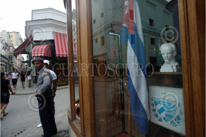 LA HABANA, CUBA, 02ABRIL2009.- Bandera y estatuilla de José Martín al lado un policía vigila las calles de la vieja Habana. FOTO: MAX NÚÑEZ /CUARTOSCURO.COM