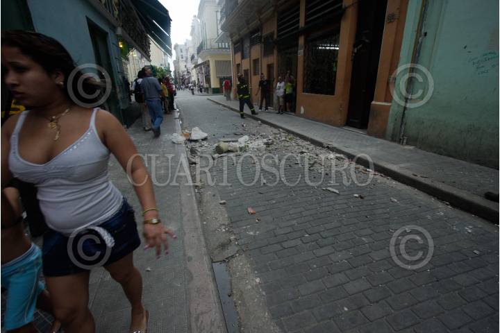 LA HABANA, CUBA 03ABRIL2009.-Un pedazo de fachada de un balcón en una casa particular de la vieja habana se desgajo causando solo daños materiales en la acera, donde el cuerpo de bomberos llego a controlar la situación, donde estructuras coloniales visiblemente frágiles forman parte de casi todas las calles del corazón de la Habana. FOTO: MAX NÚÑEZ/CUARTOSCURO.COM