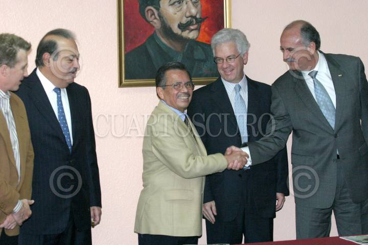 MEXICO, D.F, 13OCTUBRE005.- Emanuel Hacha, empresario, Carlos Slim Helú, presidente vitalico del grupo CARSO, Haldio Ramírez, lider de la CNC , Gustavo Gastón y Jose Luis Barraza, presidente de la COPARMEX, ratificaron el Acuerdo Nacional para la Unidad, el Estado de Derechos, el Desarrollo, la Inversión y el Empleo, en un encuentro sostenido en las instalaciones de la CNC. FOTO: Moisés Pablo/CUARTOSCURO.COM