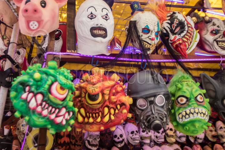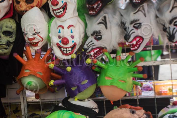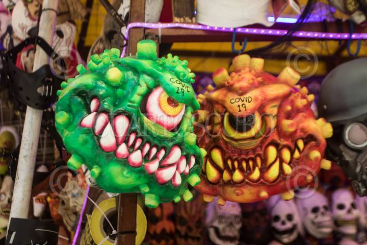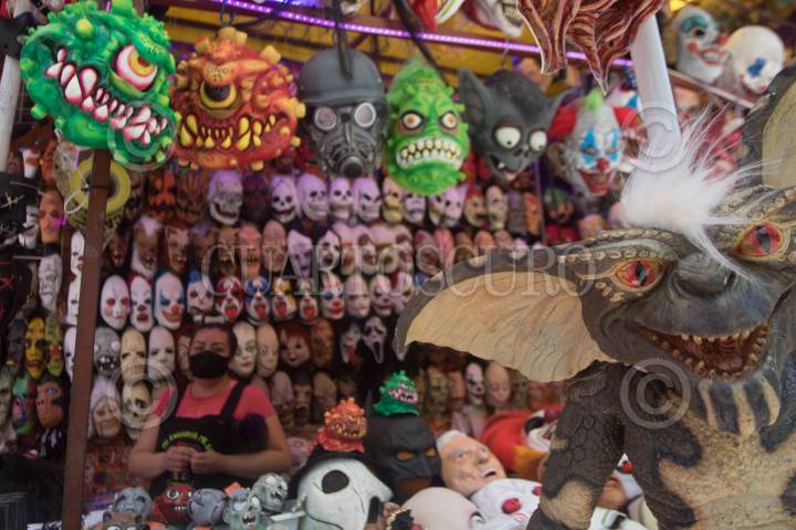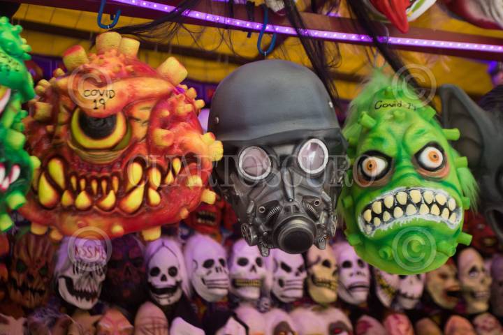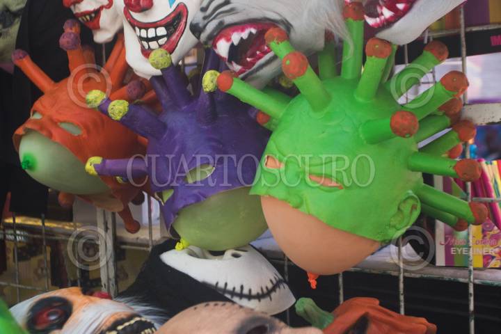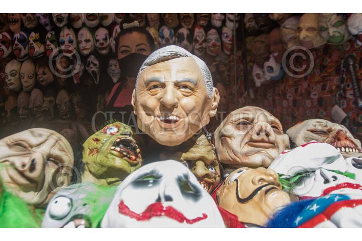 Máscaras para los festejos de día de Muertos, se aprestan en mercados públicos de la Capital. Las mas buscadas son del Coronavirus o Covid 19, pero también las del Presidente Andrés Manuel López Obrador, El Chapo Guzmán, entre otros.