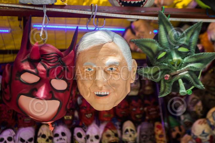 CIUDAD DE MÉXICO, 31OCTUBRE2019.- Máscaras, maquillaje, disfraces, calaveritas de dulce, flores, abundan en los mercados de la Ciudad. Mañana se celebra el día de los Santos inocentes. José José y el Presidente Andrés Manuel López Obrador, entre las máscaras mas novedosas. FOTO: VICTORIA VALTIERRA /CUARTOSCURO.COM