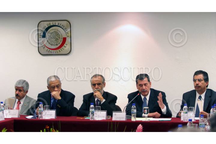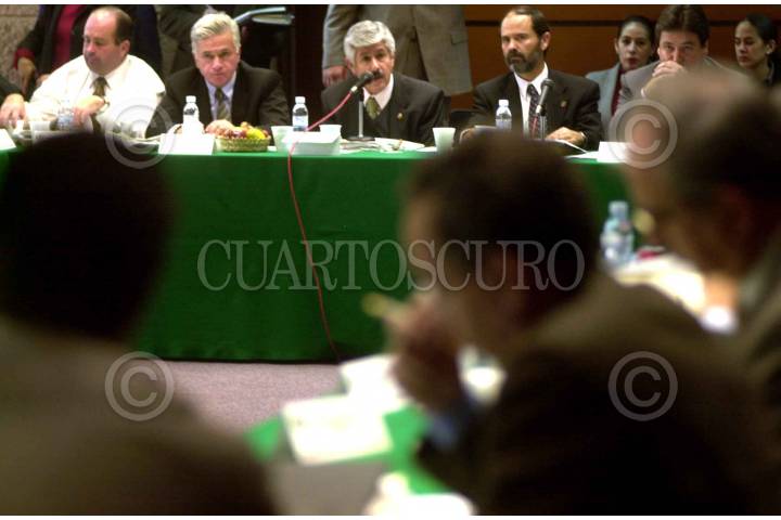 México,D.F., 30JULIO2004.- La camara del Senado, instalo una mesa de trabajo para analizar las reformas a las Ley del IMSS. En la imagen, Faussi Hamdan, Nezahualcoyotl de la Vega, Diego Fernández de Ceballos, Enrique Jackson y Jesús Ortega. FOTO: Moisés Pablo/CUARTOSCURO.COM