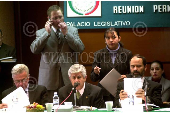 México D.F19DIC2003.-Los senadores Demetrio Sodi (PRD), Fauzi Hamdan (PAN), el diputado Gustavo Madero (PAN) y el senador Alejandro Gutiérrez del (PRI) durante la reunión de la Comisión Nacional de Hacienda y Crédito Público que se llevo a cabo en la Cámara de Diputados. FOTO: Eunice Adorno/CUARTOSCURO.COM