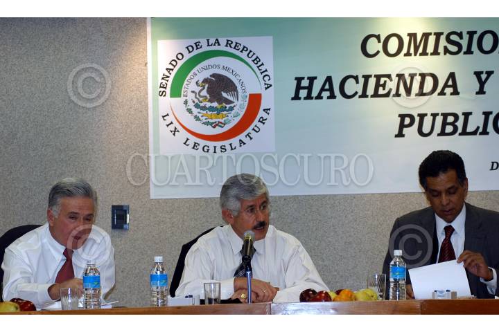 MEXICO, D.F., 13ABRIL2005.- Demetrio Sodi, senador del PRD, Guillermo Ortiz, gobernador del Banco de México, Fauzi Hamdan, senador del PAN y Dulce María Sauri, senadora del PRI, durante la reunión de la Comisión de Hacienda y Crédito Público, realizada en el Senado. FOTO: Moisés pablo/CUARTOSCURO.COM