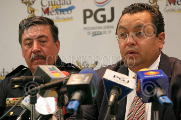MÉXICO, D.F., 28 DE OCTUBRE DE 2008.- Genaro Gutierrez Gutierrez y Luis Genado Vázquez, durante la conferencia de prensa en la Procuraduria Capitalina donde presentaron a los integrantes de la Banda de los Ticos, presuntos responsables de robos a casas habitacion en zonas residenciales. FOTO: VICTORIA VALTIERRA/CUARTOSCURO.COM