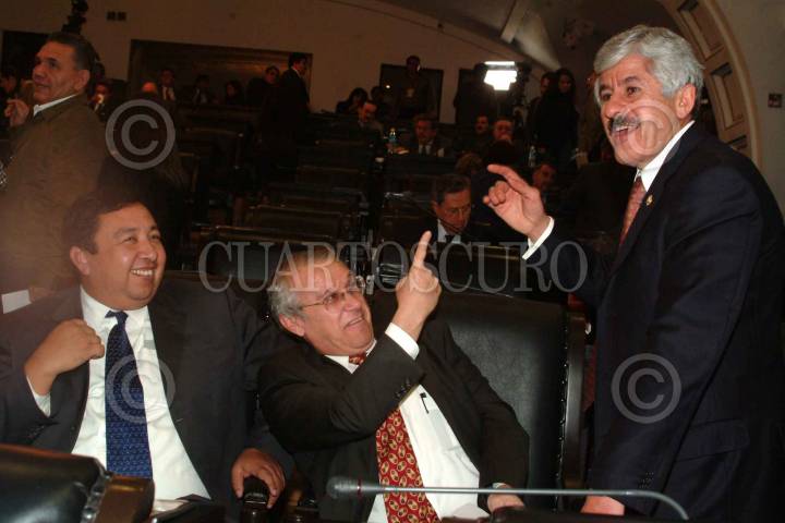 MEXICO, D.F. 07DICIEMBRE2004.- Los legisladores Demetrio Sodi del PRD, Juan José Rodríguez y Fauzi Handam (ambos del PAN), conversan durante la sesión ordinaria de la Cámara de Senadores. FOTO: Germán Romero/CUARTOSCURO.COM