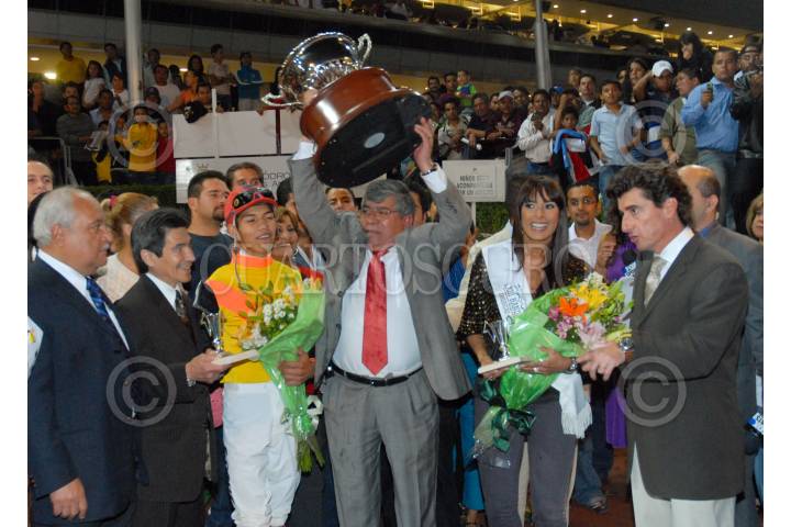 MÉXICO D.F. 31MAYO2008.-Festejo del Director del Hipodromo Sergio Alama, Jose Manuel Alavés Presidente de la Asociación del Desarrollo y Fomento de la Hípica, así como Galilea Montijo y el jinete Ganador Erick Cruz Gimenez. FOTO: FELIPE CASTELLANOS/CUARTOSCURO.COM