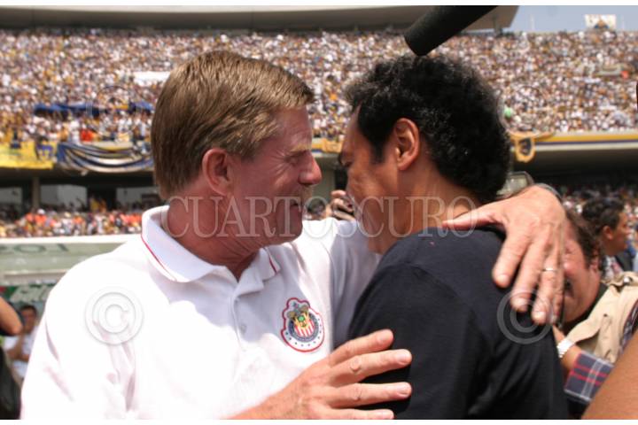 México, D. F. 13 Junio 2004.- Hans Westerhoff, director técnico de las chivas del Guadalajara y Hugo Sáchez director técnico de los Pumas se saludan previo al partido final del torneo de Clausura 2004. FOTO: Moisés Pablo/CUARTOSCURO.COM