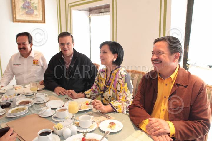 ZACATECAS, ZACATECAS, 19JUNIO2010.- Antonio Mejía Haro, candidato a la gubernatura del PRD, Marcelo Ebrard Casaubón, Jefe de Gobierno, Amalia García Medina, gobernadora del estado y Carlos Navarrete, presidente de la mesa directiva del Senado de la República, se reunieron por la mañana durante una gira de apoyo a la campaña proselitista del "El Tigre Toño Mejía". FOTO: CUARTOSCURO.COM