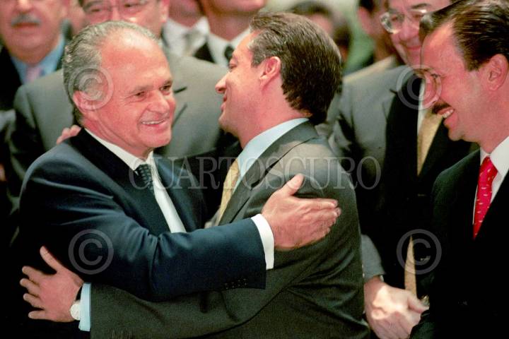 Alfredo Harp Helú y Manuel Medina Mora, dueño y director de Banamex Accival, durante la concretación de la firma de venta al Citygrup. FOTO: Victoria Valtierra/CUARTOSCURO.COM