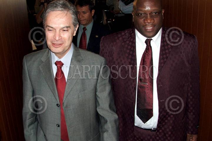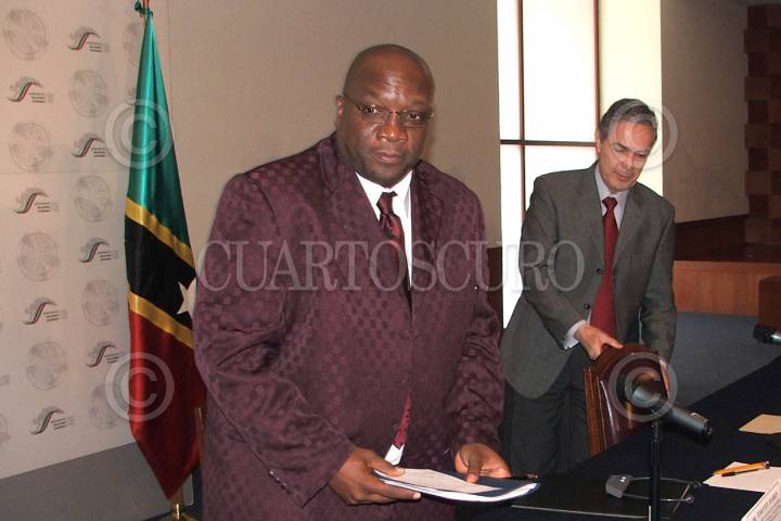 MEXICO D.F. 29SEPTIEMBRE2006.- Timothy Harris ministro de asuntos exteriores de San Kitts y Nevis junto con el canciller Luis Ernesto Derbez en las instalaciones de la Secretaria de Relaciones Exteriores, donde firmaron un convenio bilateral para la construcción de dos estaciones de policia con el apoyo del gobierno mexicano en el marco de cooperación que México brinda a esta nacion del Caribe Oriental. FOTO: SAÚL LÓPEZ ESCORCIA/CUARTOSCURO.COM