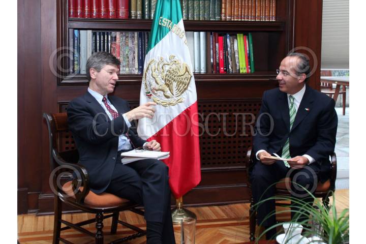 MÉXICO, D.F. 25NOVIEMBRE2009. Felipe Calderón Hinojosa, Presidente de México se reunió esta tarde en la residencia Oficial de los Pinos con el Sñr. Jefreey Sachs reconocido economista estadounidense, egresado de la universidad de Harvard, actualmente es director The Earth Institute de la Universidad de Columbia y director del proyecto del milenio de las Naciones Unidas. FOTO: ALFREDO GUERRERO/CUARTOSCURO.COM
