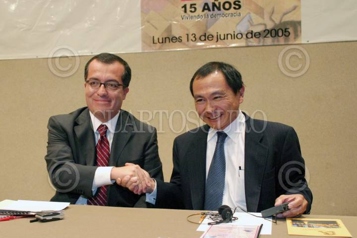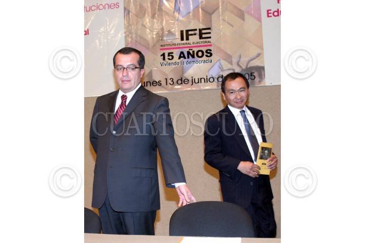 MEXICO; D.F., 13JUNIO2005.- Luis Carlos Ugalde, presidente Consejero del IFE y Francis Fukuyama, doctor en Ciencia Política por la Universidad de Harvard, durante la conferencia magistral "La Democracia, las Instituciones y el Estado", realizado en la sede del Instituto Electoral. FOTO: Moisés Pablo/CUARTOSCURO.COM
