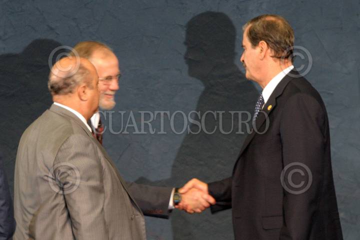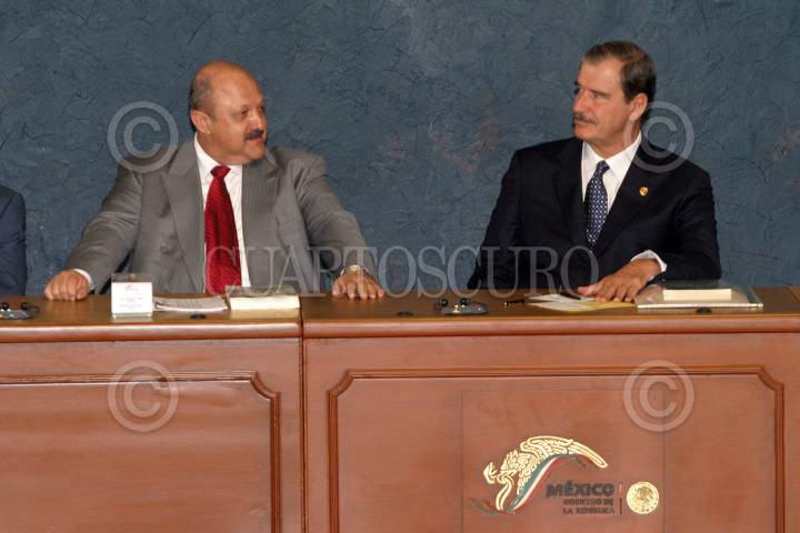 MÉXICO D.F. 06NOVIEMBRE2006.- El secretario de Educación Pública Reyes Tamez Guerra y el presidente Vicente Fox Quezada, durante la evaluación de cuatro programas de educación basica por la escuela de posgrado de educación de la Universidad de Harvard, en la residencia oficial de los Pinos. FOTO: GUILLERMO PEREA/CUARTOSCURO.COM